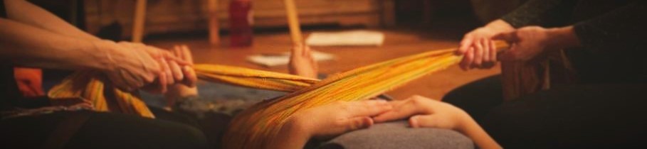 - On se sert de nos belles écharpes, et on la berce. On l’étire très subtilement. On l’enveloppe. On la serre. À travers nos belles écharpes tissées, on sent des tensions se libérer. On contient. Ça va. Ces souvenirs, ces appréhensions et les émotions qui y sont attachées, elles peuvent sortir. On contient. Jusqu’à ce que ce soit l’apaisement.